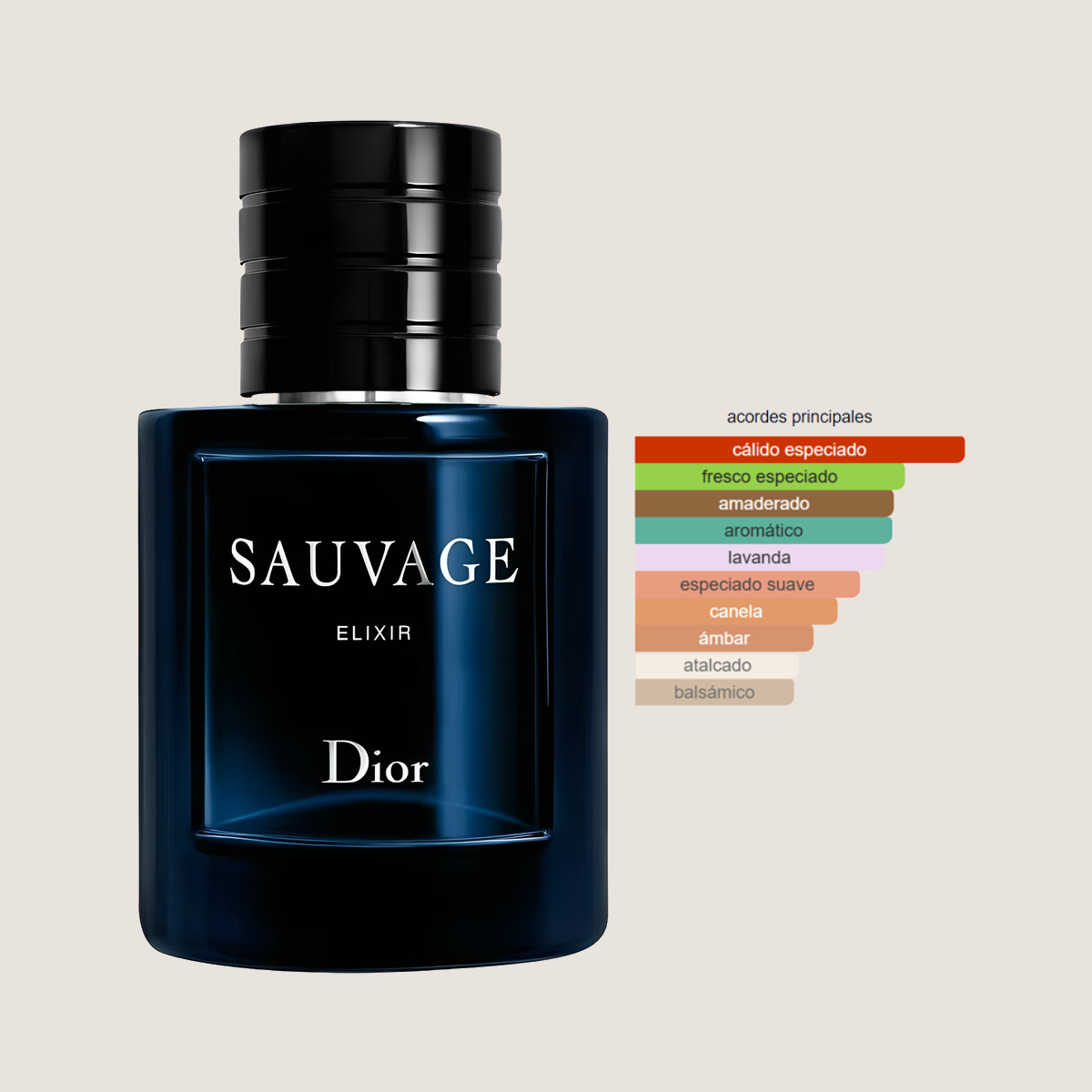 Sauvage Elixir lleva la línea Sauvage a un nivel mucho más oscuro, denso y refinado. Es una explosión especiada desde el inicio, con canela, nuez moscada, cardamomo y pomelo que lo hacen vibrante y cálido. En el corazón se siente la lavanda con un toque herbal y fresco, pero rápidamente da paso a un fondo profundo y envolvente de licor, ámbar, sándalo y vetiver.